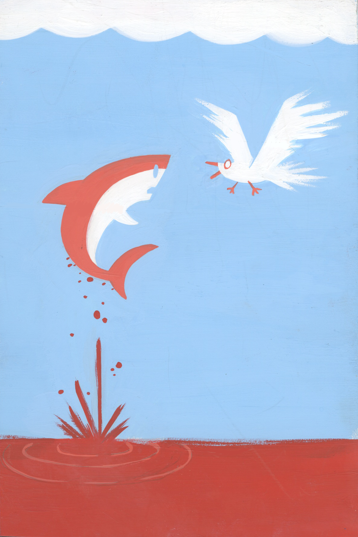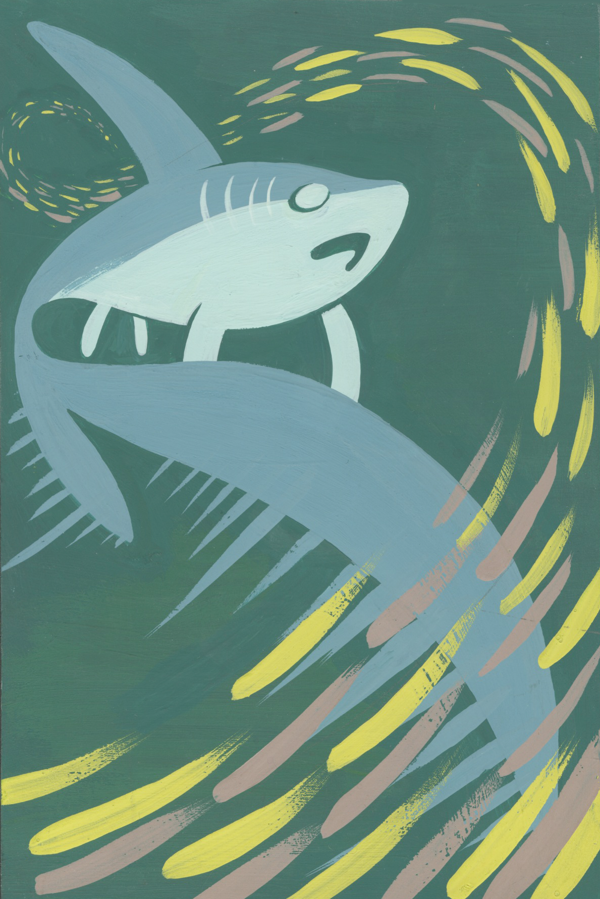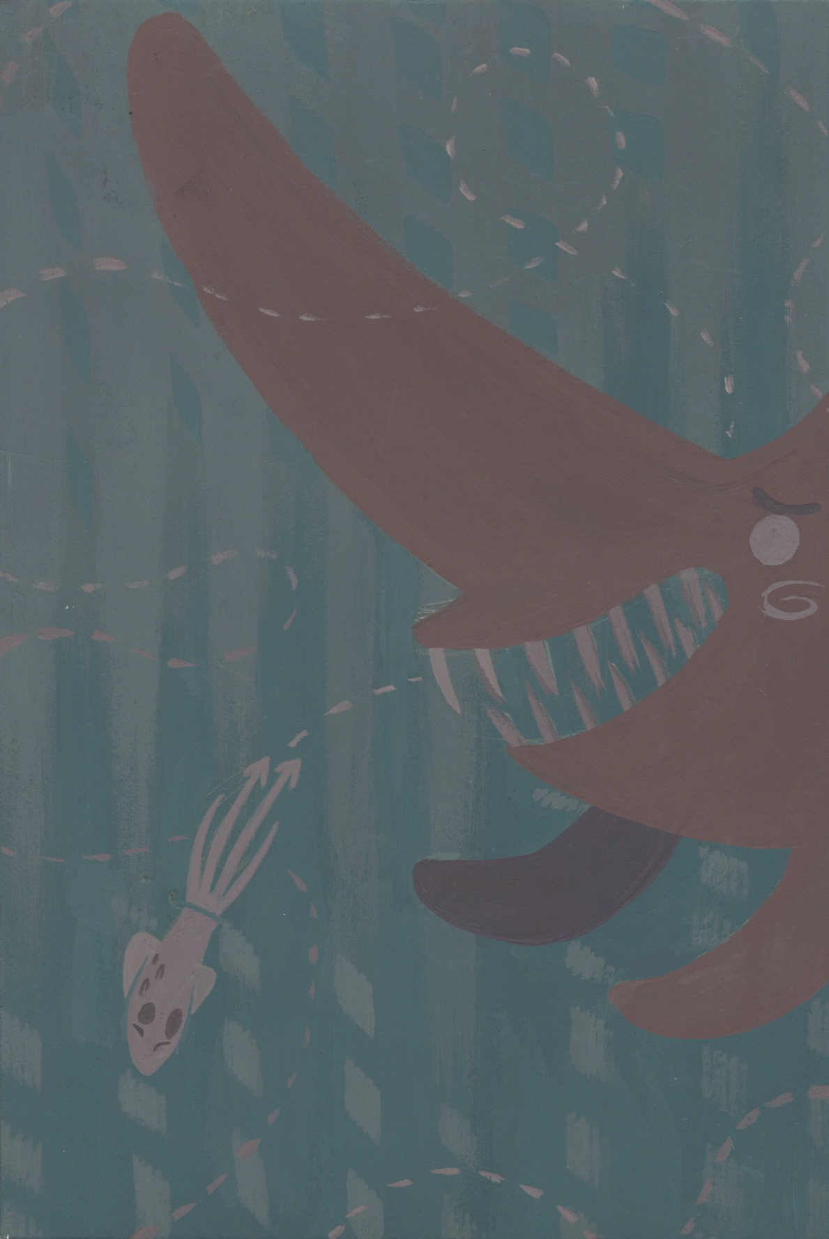 Seven gouache paintings of sharks and their eating habits. 4x6 on Bristol.